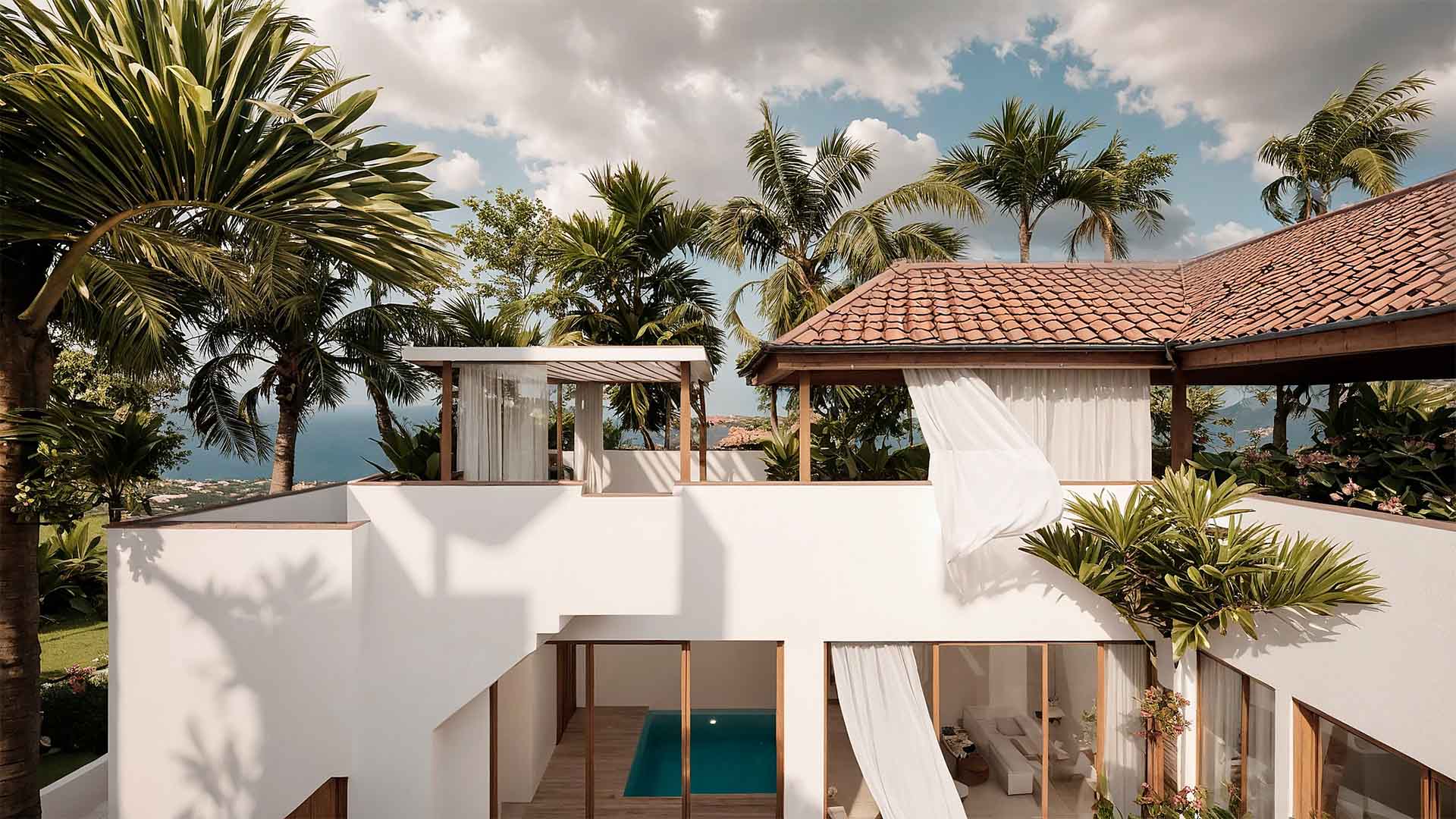 The master suite is located upstairs and enjoys peaceful views toward the beach and surrounding tropical gardens. Two additional bedrooms are positioned on the ground level, providing easy access to the pool and garden areas.