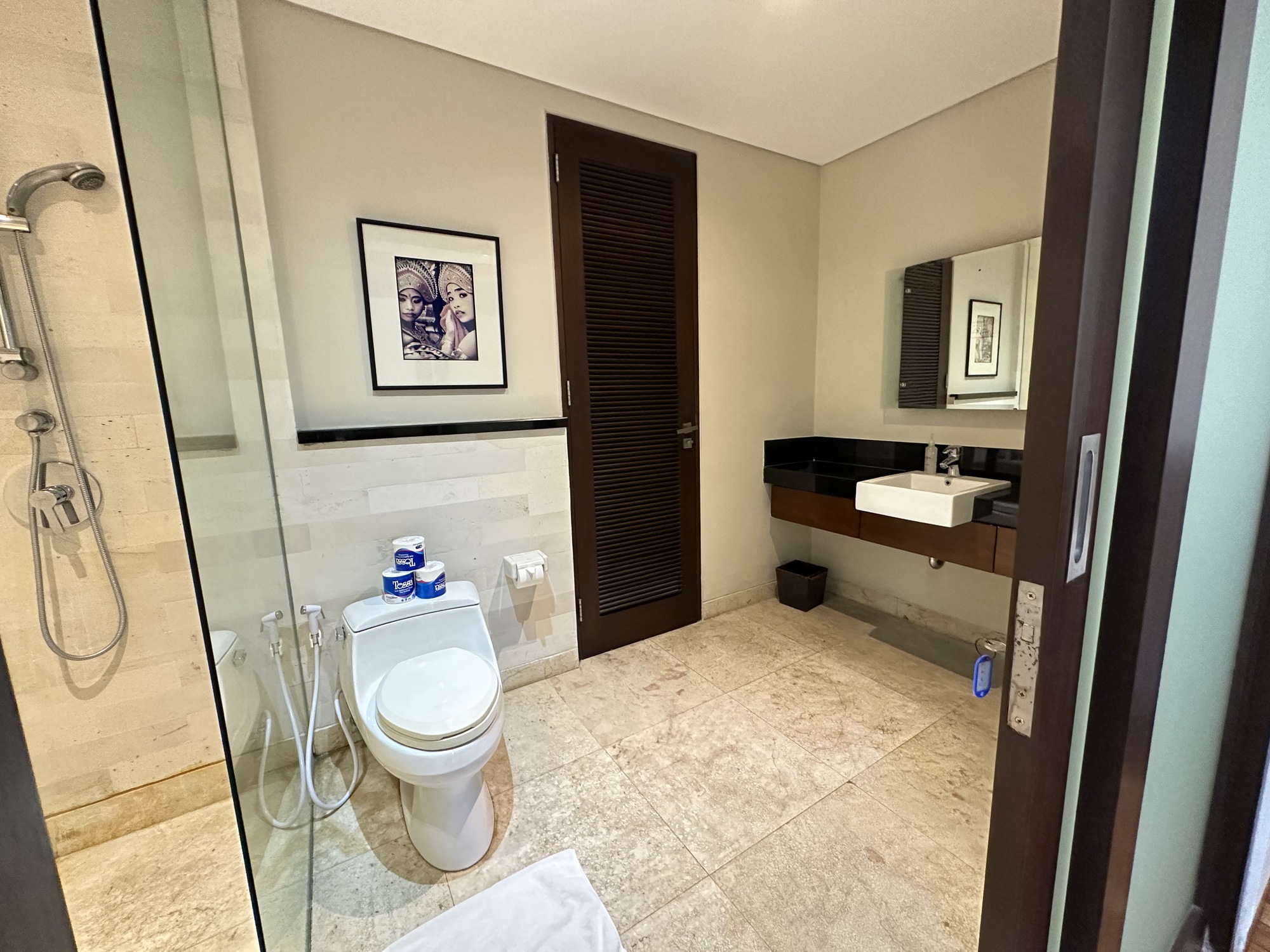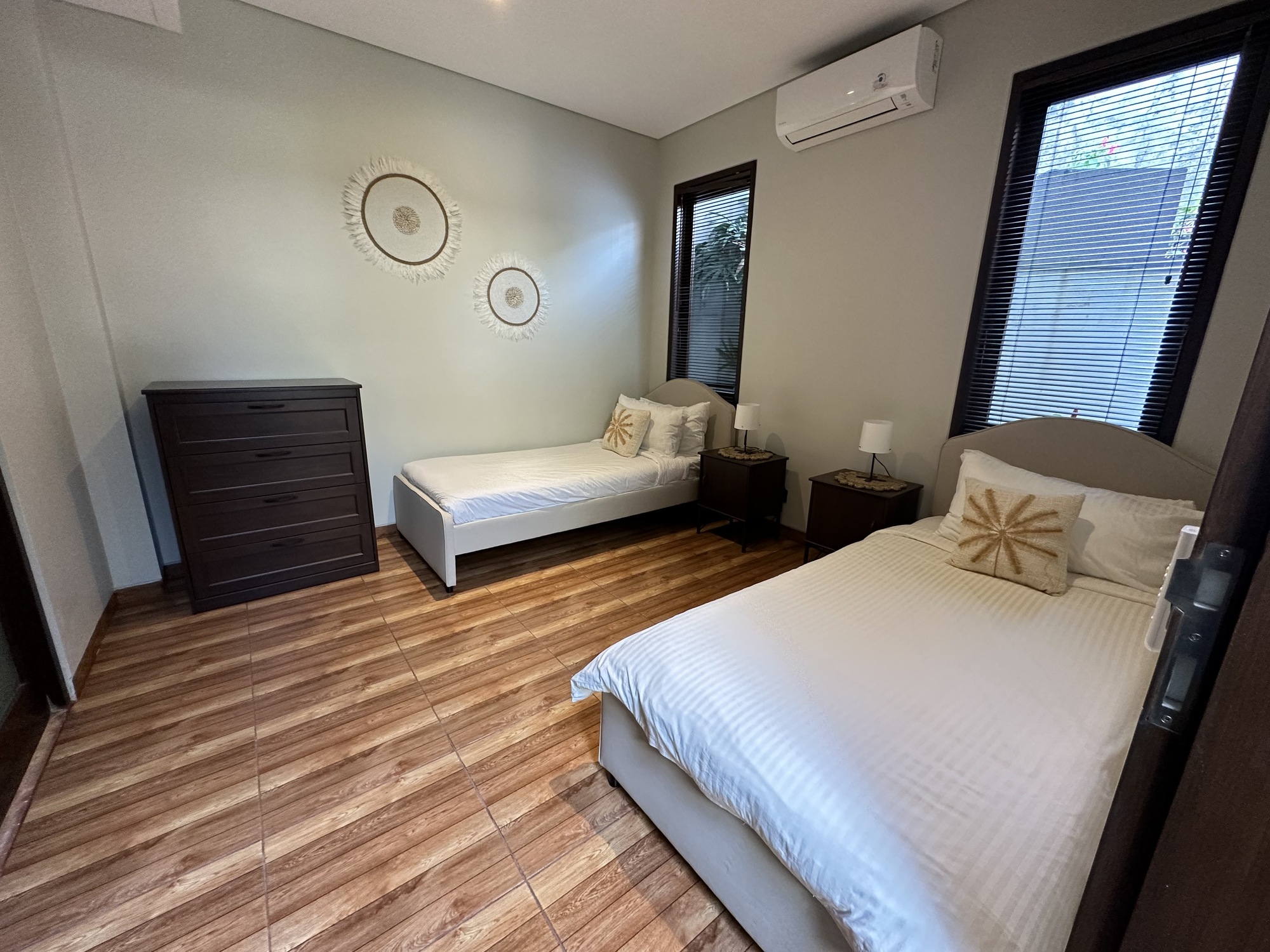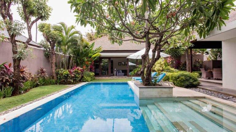 This luxury 5 bed villa epitomes style, luxury and comfort. It is situated right on the beachfront at Sanur in the gated complex of Kejora Villas-Suites. The villa has 5 bedrooms and can sleep 10 people, Two pool facing bedrooms have king sized beds with ensuite bathrooms. The third queen bedroom is set up with an extra room with 2 single beds. Both rooms access the luxurious bathroom in this suite and face the pool. Very comfortable mattresses and crisp white cotton sheets. The 5th bedroom has a double bed and a small ensuite. bathroom. All bedrooms are air conditioned. Villa 3 is larger than most villas at Kejora and has a spacious garden area around the pool. Outdoor shower is a must in this balmy climate. First quality furniture completes the executive quality ambiance in this villa. . The ideal private villa for a luxurious adult getaway or bring the family. The infinity pool is set amongst a gorgeous garden and undercover bale to relax and enjoy a meal or a cocktail. Many hours will be spent enjoying the luxury of the tropical gardens and pool lounges.Furnished in traditional Balinese decor, Villa 3 offers the ultimate in luxury for your holiday. Our award winning restaurant The Glass House is on your doorstep to either dine in or have room service delivered from one of the top restaurants in Sanur