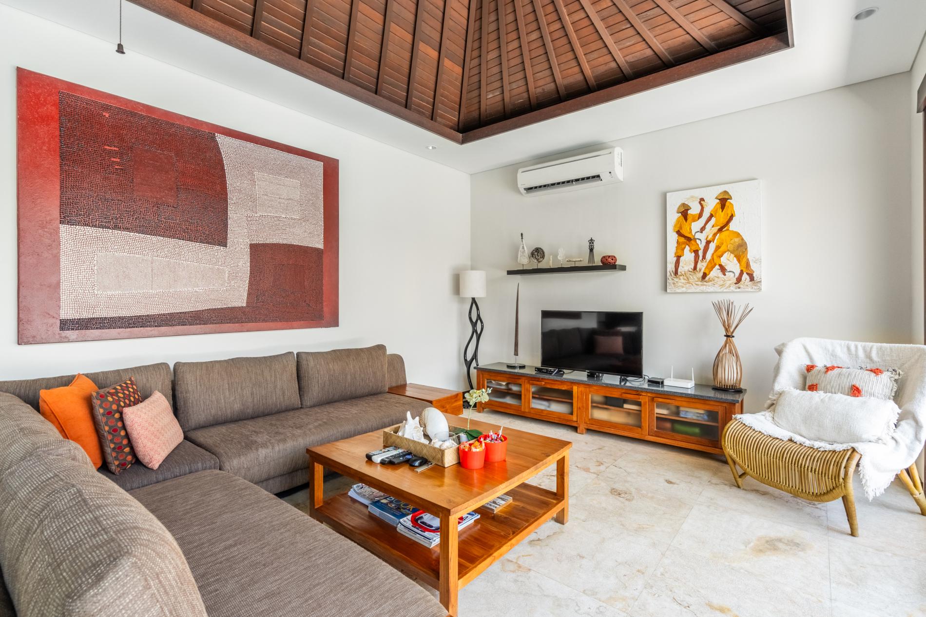 The living area is furnished with comfortable seating and traditional Balinese décor that creates a warm and inviting atmosphere.