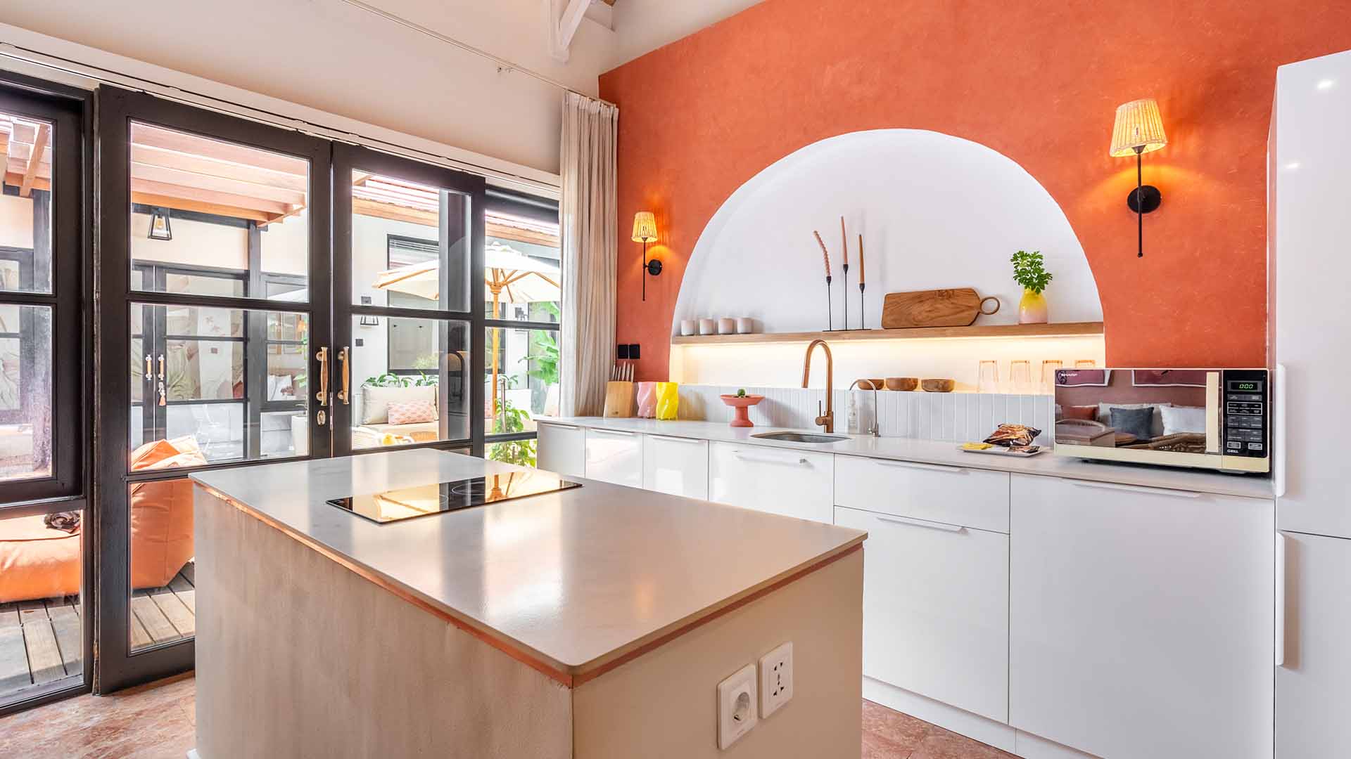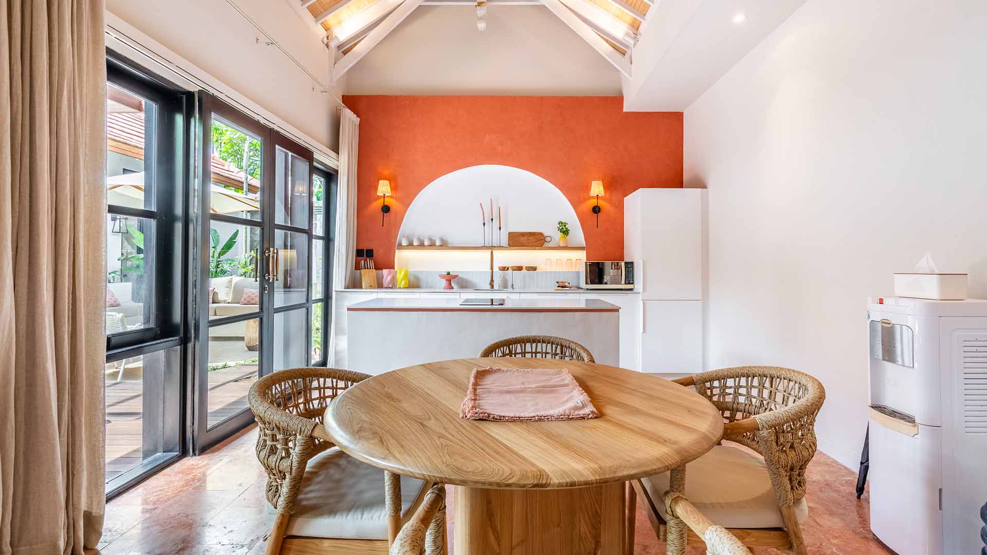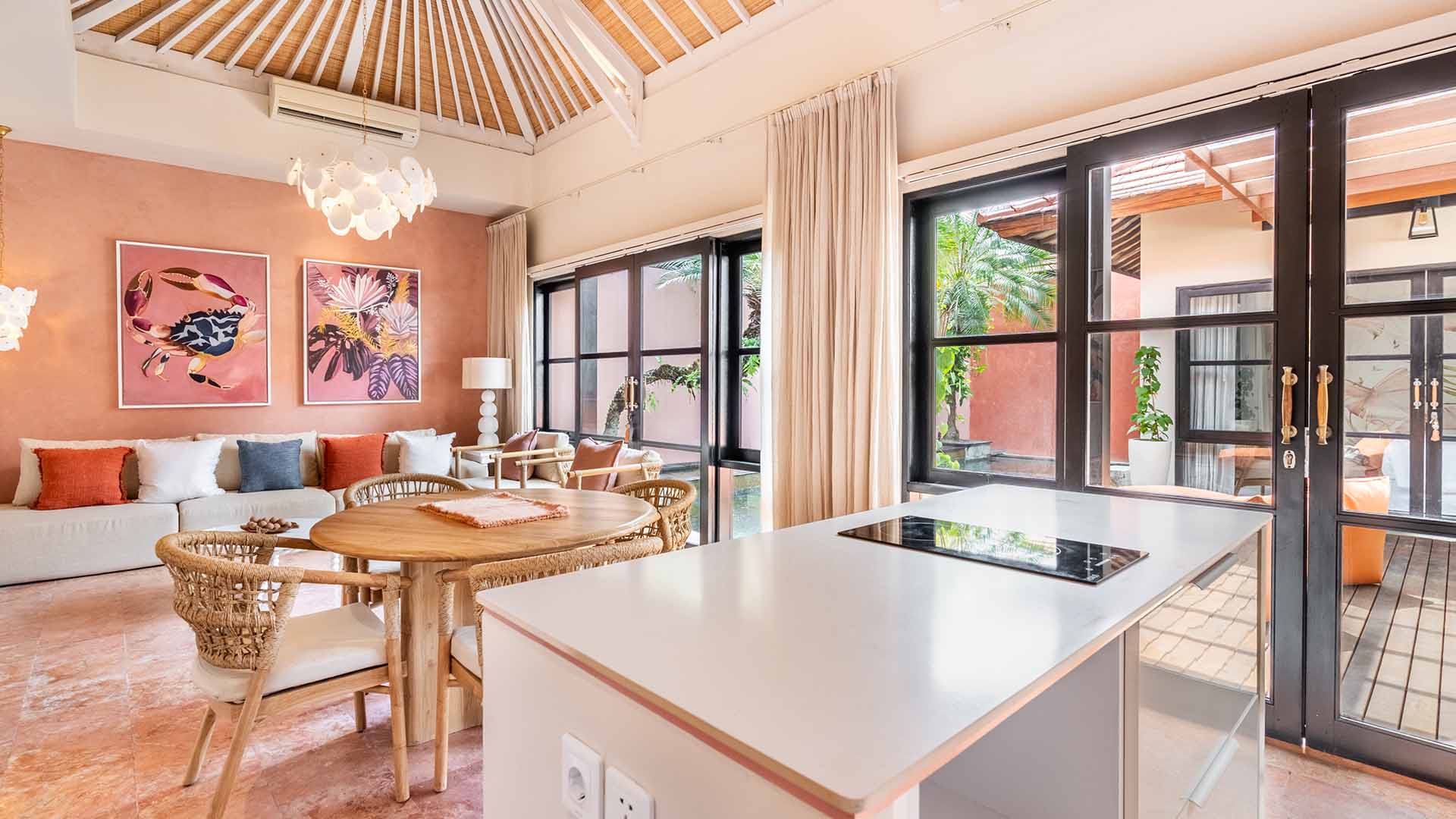 The contemporary state-of-the-art kitchen includes an induction cooktop, large refrigerator, microwave, and a dedicated supply of drinking water, making in-villa dining effortless.