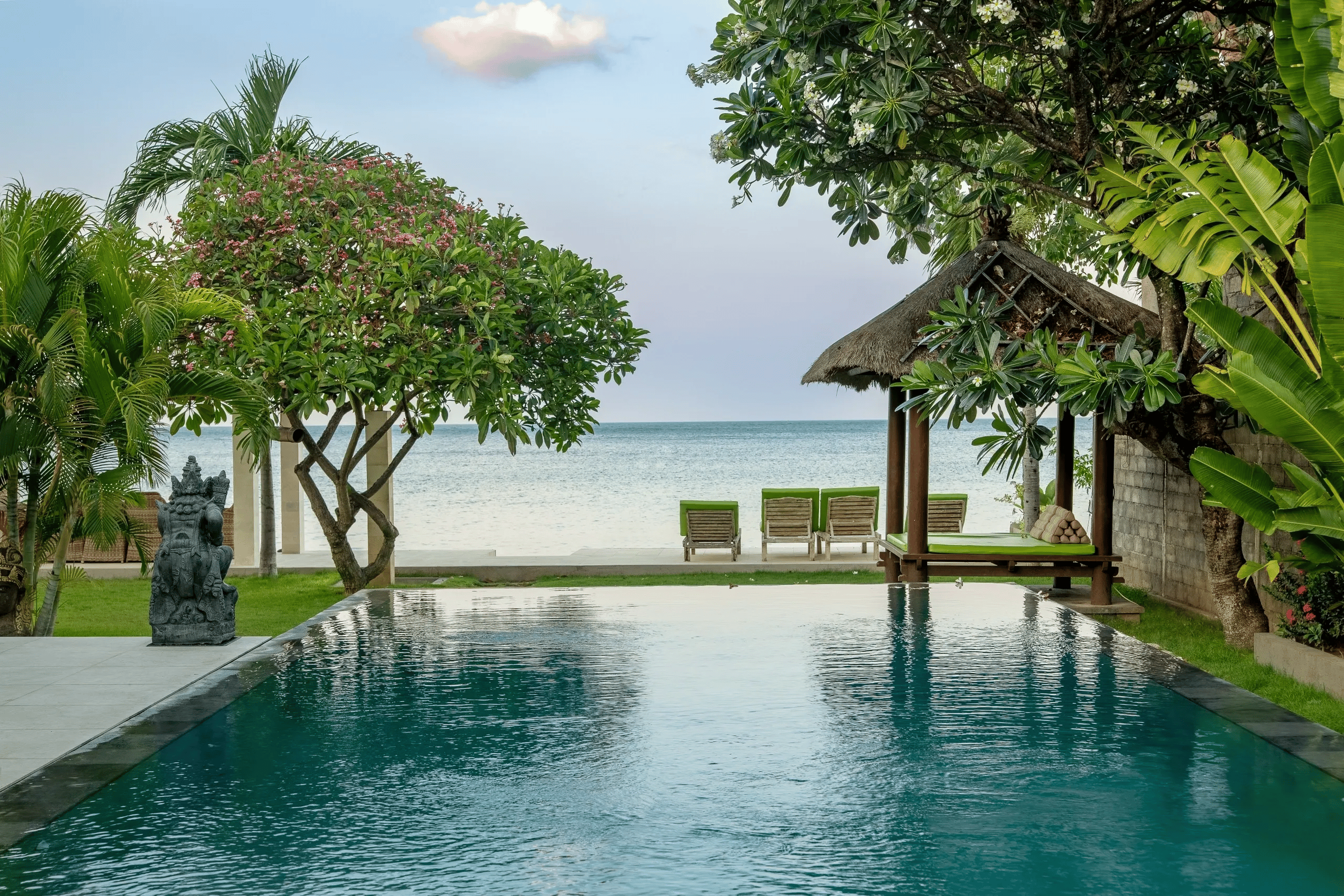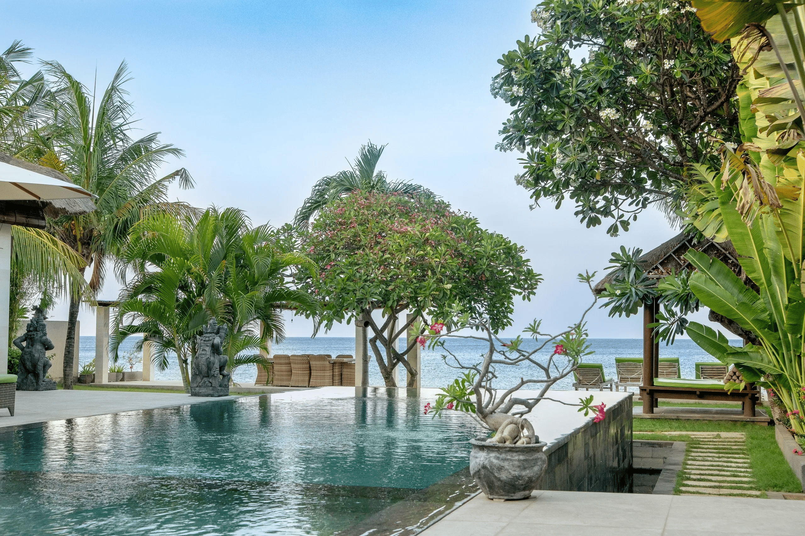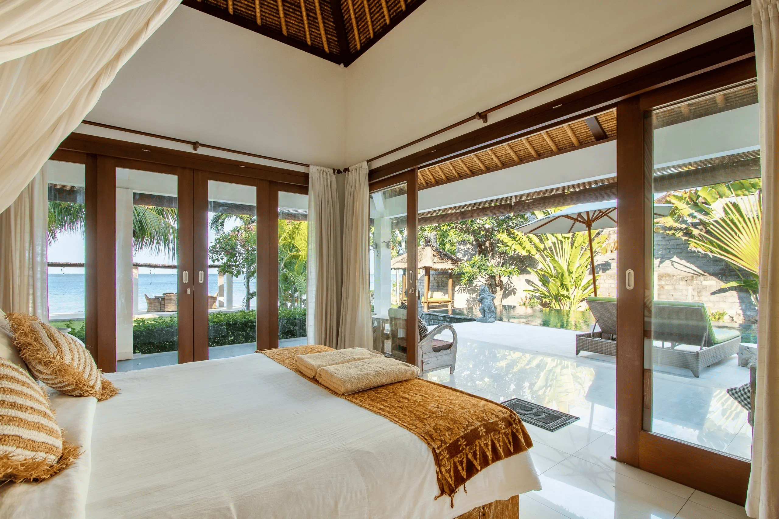 A gorgeous beachfront villa created for peaceful and relaxing living. Settled at the edge of the Bali Sea in Amed and featuring the unique architecture of modern Balinese style. This tropical retreat offers 4 stunning oceanfront bedrooms. Due to its unique location, the villa enjoys unlimited sunrises all year round.
