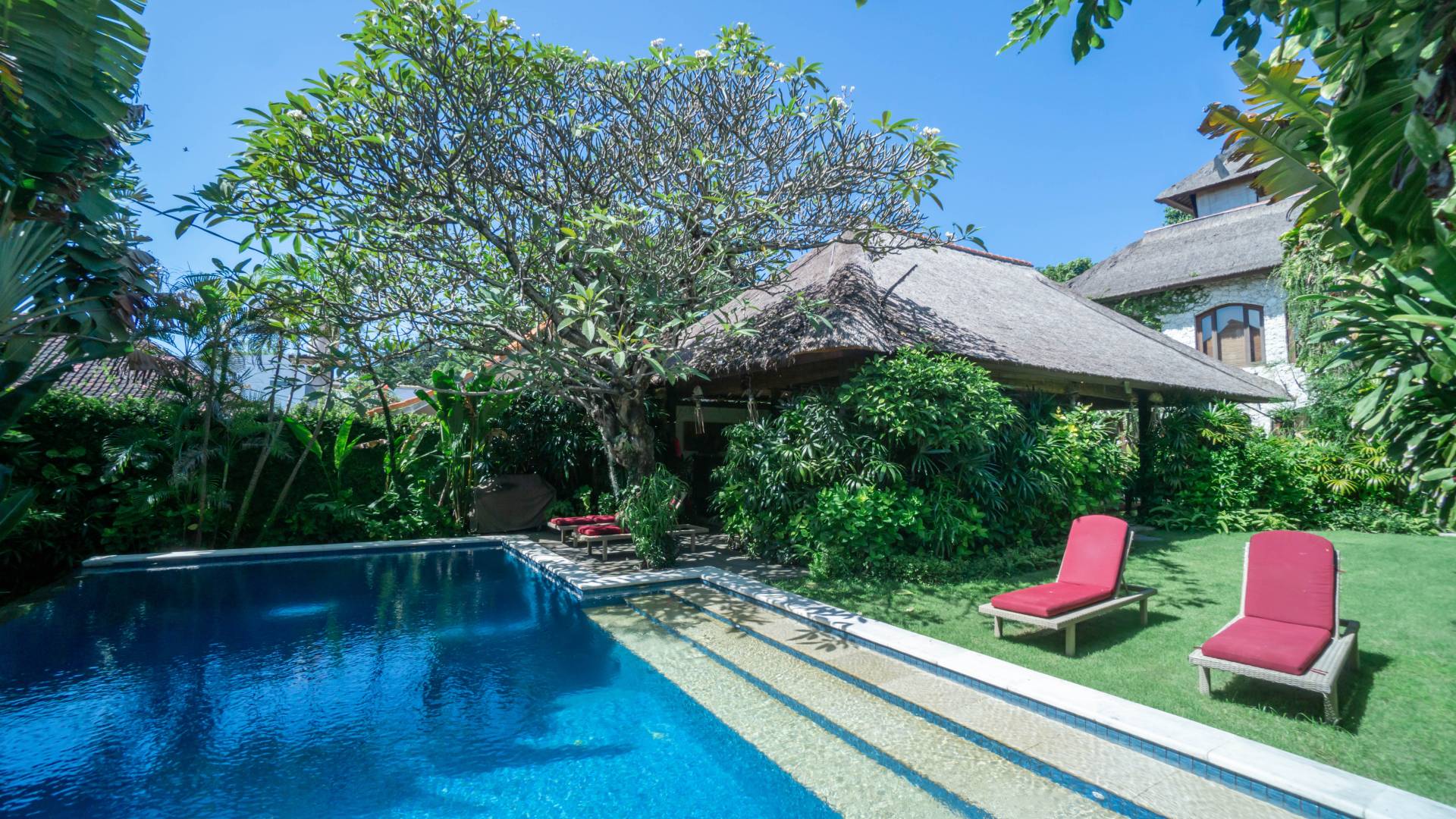 • Large swimming pool and lush tropical gardens